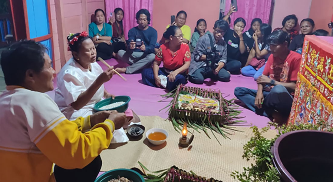 Mak Okon melakukan ritual memakan beretih, telur rebus, dan pisang sebagai syarat pelaksanaan Bele Kampung [Foto : Bahtera Alam]