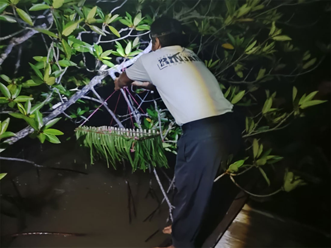 Agin, meletakkan ancak laut di dahan mangrove ujung tanjung Pulau Padang [Foto : Bahtera Alam]
